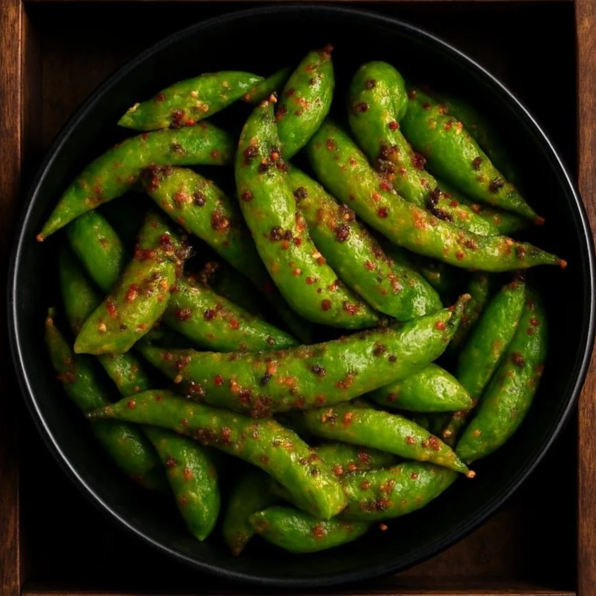 Stream edamame traffle salt with rayu marinated soy sauce.